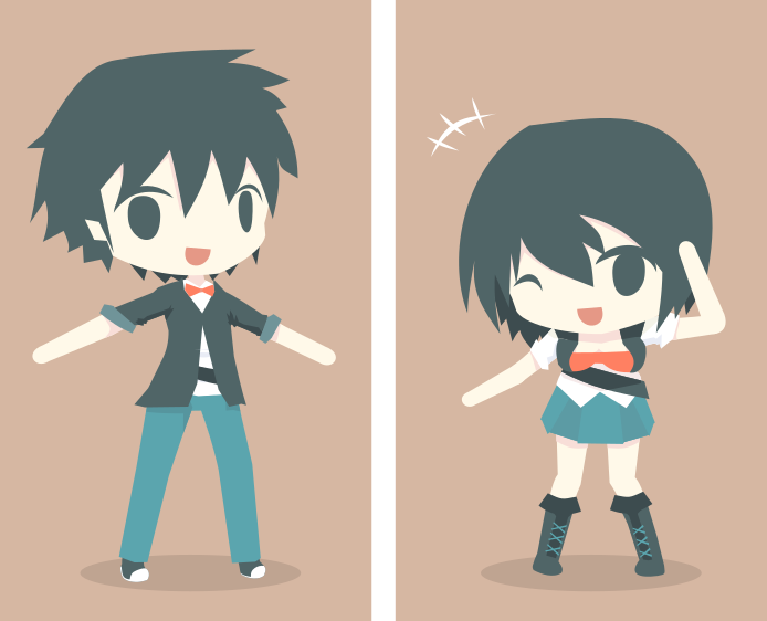 This features two cartoon characters, a boy and a girl, standing next to each other. Both of them are wearing anime-style clothing, with the boy dressed in black and teal pants, while the girl is wearing an aqua skirt and black combat boots. They both have one arm out to the side and one raised towards their head, giving off a playful vibe. The characters are positioned on a brown background that adds depth to the scene.