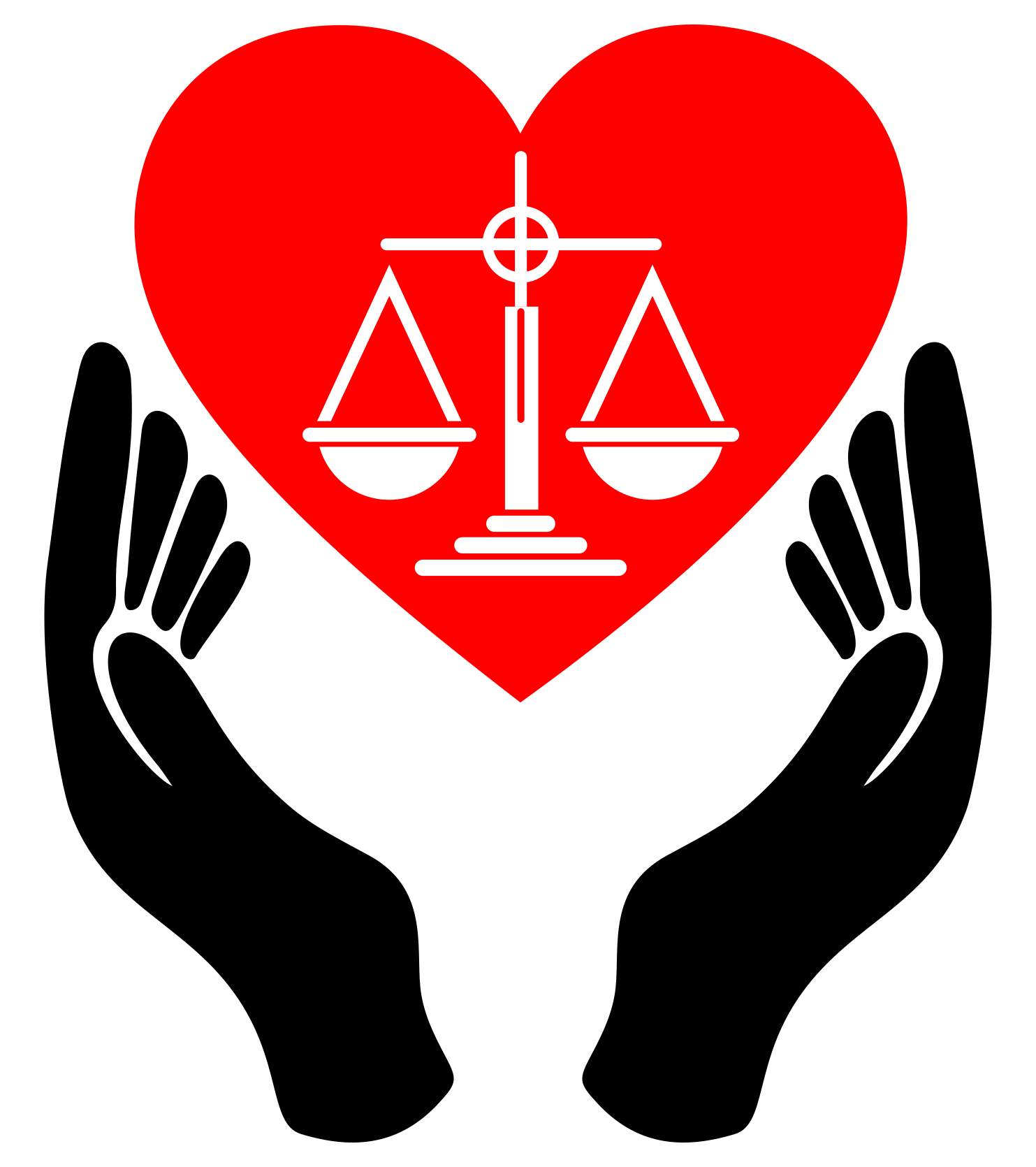 This features a heart-shaped design with an outline of a hand holding a scale, which is also known as a balance or a set of scales. Inside the heart, there are two large white scales, one on top and another below it. Above the scales, there is a small red cross, adding to the overall visual appeal of the design. The heart itself has a red background, making it stand out against the rest of the image.