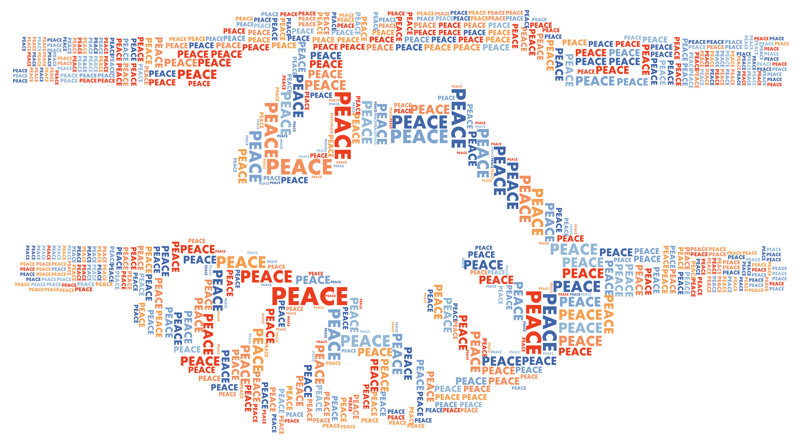 This features a word cloud made up of the word "peace" and its various forms. The word is written in different colors, creating an eye-catching visual effect. The word "peace" appears multiple times throughout the cloud, with some variations appearing larger than others. This unique display of words creates a sense of unity and harmony, emphasizing the importance of peace in our lives.