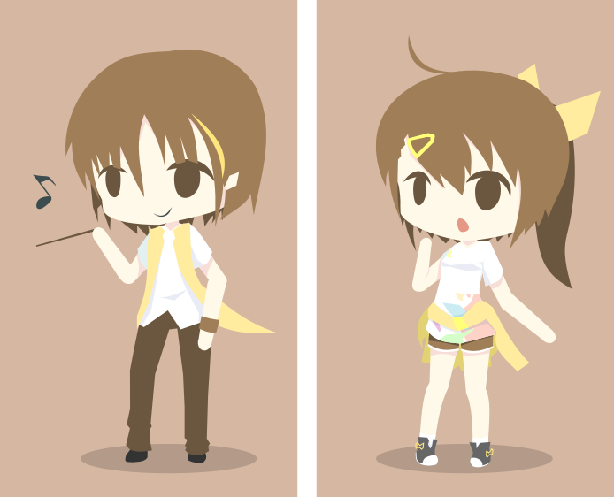 This features two cartoon characters, one on the left and another on the right side of a brown background. Both characters are wearing yellow scarves around their necks, adding a pop of color to the scene. They appear to be singing into microphones, with one character holding a music note in its hand. The other character is holding a cell phone, possibly capturing the moment or communicating with someone else. The characters are positioned at different angles and heights, creating an interesting visual effect. One of them has a tie on, adding to their unique appearance. Overall, the image showcases two distinctive cartoon figures in a creative setting that highlights their individuality and shared interest in music.