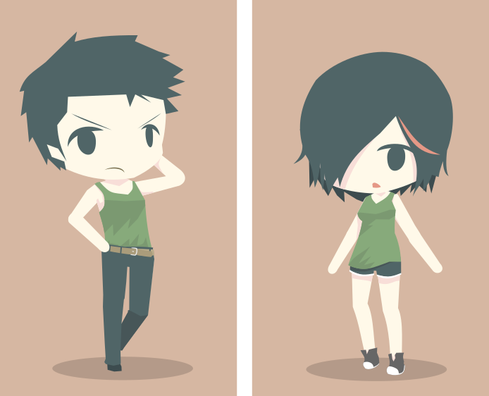 This features two cartoon characters, one on the left and another on the right side of a brown wall. Both characters are wearing green shirts and have distinctive appearances. One character is standing with his hands on his head while the other has her hair in pigtails. They both appear to be looking at something or someone off-camera, creating an interesting visual dynamic between them. The cartoon figures seem to be interacting with each other, adding a sense of depth and engagement to the scene.