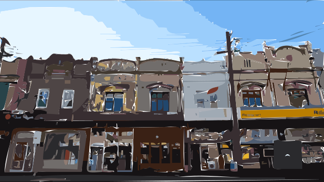 This depicts a city street with several buildings lining the sidewalk. These buildings are of various colors and styles, creating an interesting visual display. Some of the buildings have signs on their fronts, indicating businesses or other establishments within them. A few people can be seen walking along the sidewalk, going about their daily activities. The street is also home to a couple of cars parked nearby, adding to the bustling urban atmosphere. Overall, it's a lively scene that captures the essence of city life.