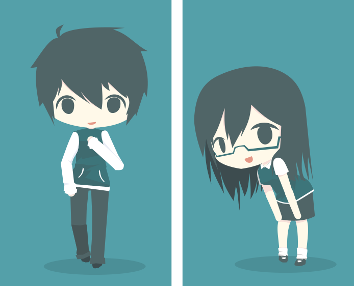 This features two cartoon characters, a boy and a girl, both wearing school uniforms. They are standing next to each other in the same pose, with one character on the left side of the frame and the other on the right. Both characters have black hair and are wearing glasses. Their outfits consist of a white shirt and dark pants, which adds to their school-like appearance. The overall scene is reminiscent of a comic book or an animated cartoon, with the two characters standing in front of a blue background that complements their attire.