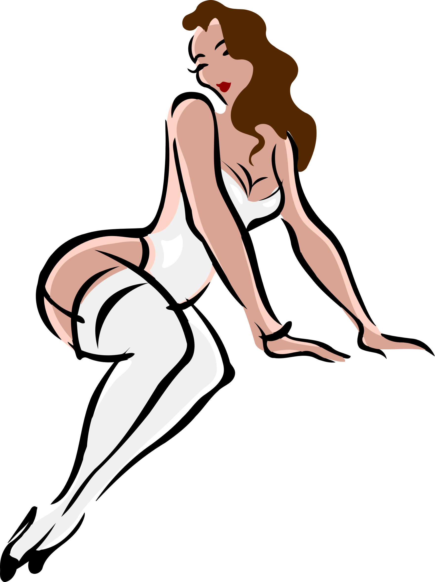This features a woman in lingerie posing for the camera. She is wearing white stockings and a bra, with her hands on her hips. Her posture suggests confidence and allure as she looks directly at the viewer. The drawing of this woman appears to be remixed from an artwork found on publicdomainpictures.net.