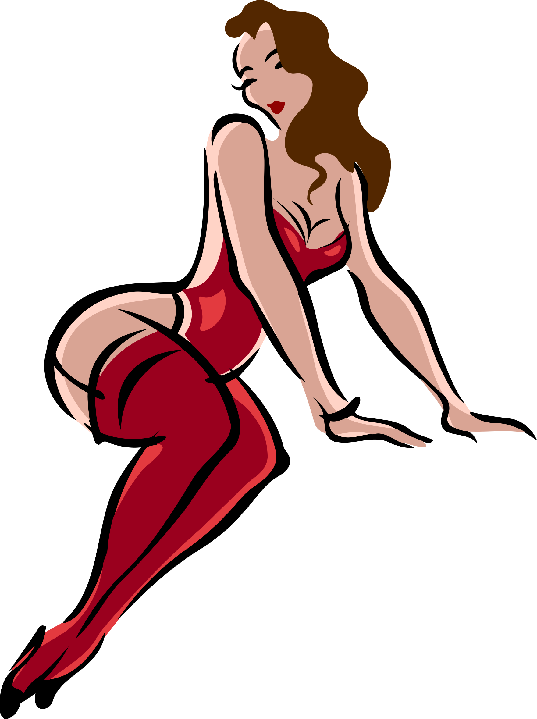 This features a woman wearing red lingerie, posing in an artistic manner. She is sitting on the floor with her legs crossed and appears to be looking at something off-camera. Her outfit consists of a red corset and stockings, which accentuate her curves. The drawing style gives the image a unique and creative touch.