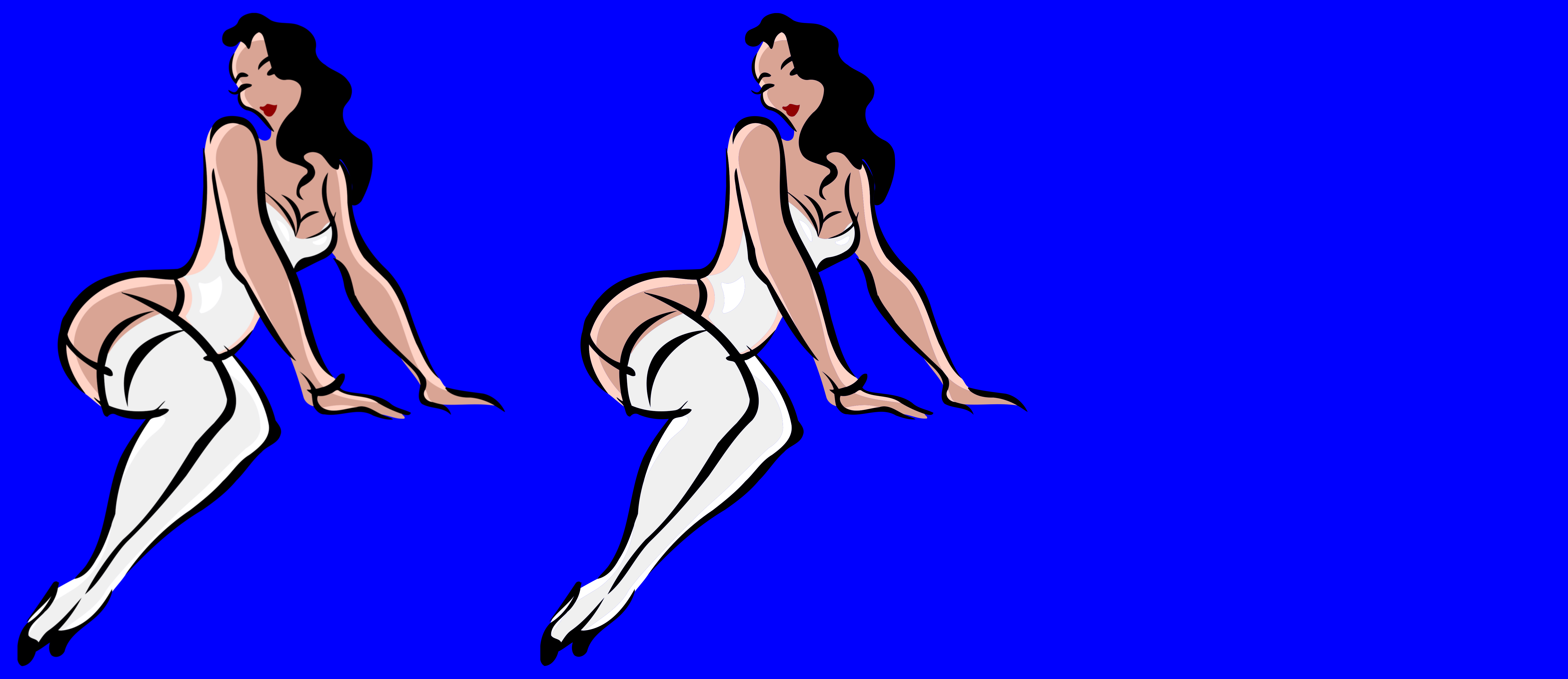 This features a woman in lingerie posing for the camera. She is wearing white stockings and appears to be striking a pose on a blue background. There are two instances of this woman, one positioned slightly higher than the other, both with their legs spread wide apart. They seem to be enjoying themselves as they showcase their lingerie in front of the camera.