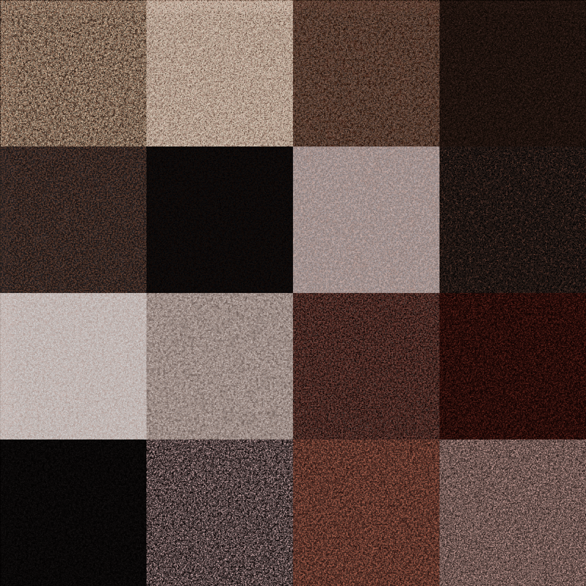 This features a collection of various textures and colors, including brown, black, gray, tan, red, and white. These different shades are arranged in a square pattern, creating an interesting visual effect. The squares are placed next to each other, showcasing the diversity of the color palette. This artistic arrangement can be appreciated for its creativity and attention to detail, as it effectively combines various colors and patterns into one cohesive design.