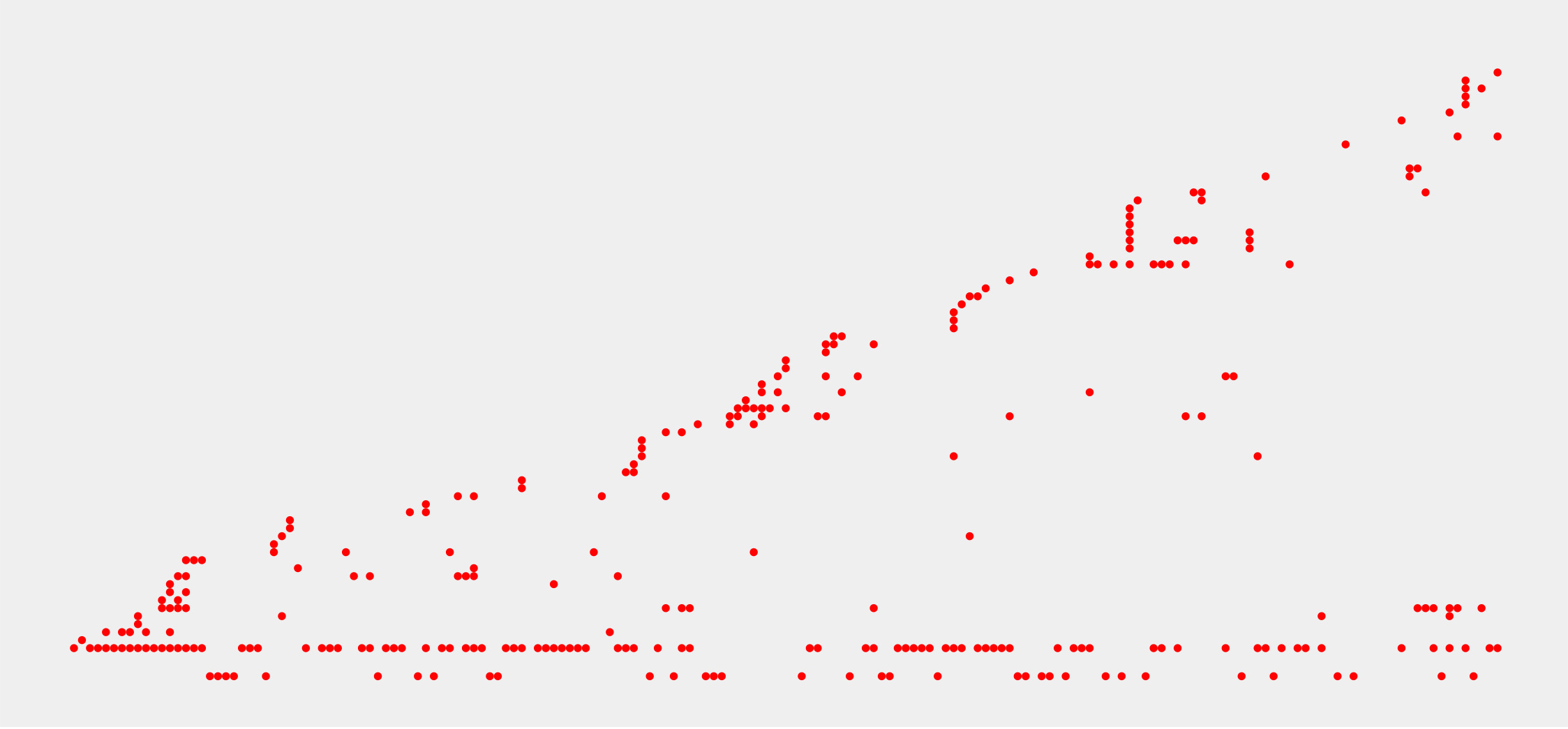 This features a large, red graph with a gray background. It is filled with numerous dots of various sizes and colors, predominantly red in color. The dots are scattered all over the graph, creating an intricate pattern that fills the entire space. This unique visual display may be used for artistic purposes or to convey information through its complex arrangement of shapes and colors.
