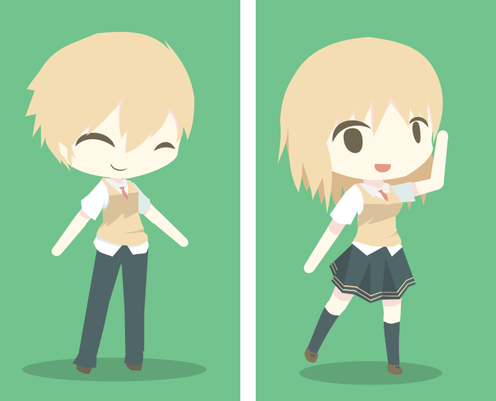 This features two cartoon characters, a boy and a girl, standing in front of a green background. They are both wearing school uniforms, with the girl dressed as a cheerleader. Both characters have smiles on their faces, giving off a friendly and positive vibe. The boy is positioned to the left side of the image while the girl stands to the right.