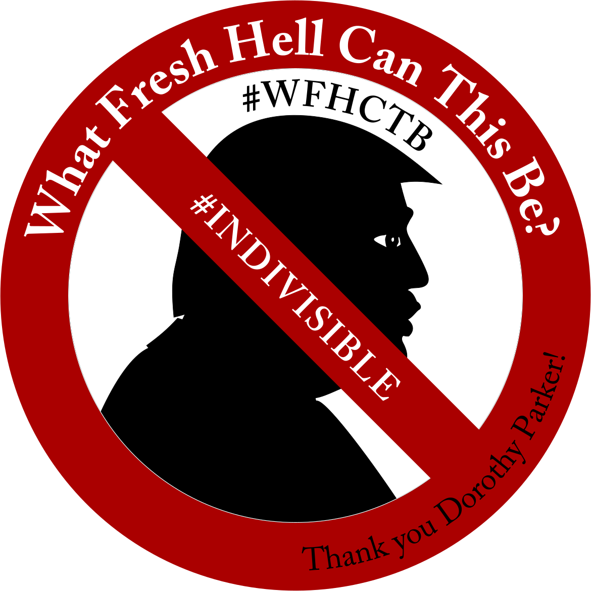 This features a red and black sign with the words "What Fresh Hell Can This Be?" written on it. Above this text, there is an image of Donald Trump's head in silhouette. The sign also has the hashtag #Indivisible #WFHCTB #DorothyParkerLivesOn in the bottom right corner, which suggests that it may be related to a political or social movement.