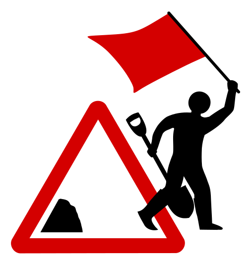 This features a red triangular sign with an illustration of a person stepping out of it. The person is holding up a red flag, which appears to be waving in the wind. This unique design creates a sense of motion and adds visual interest to the sign. The combination of the flag and the person's action suggests that the sign might be conveying a message or warning related to construction work or road conditions.