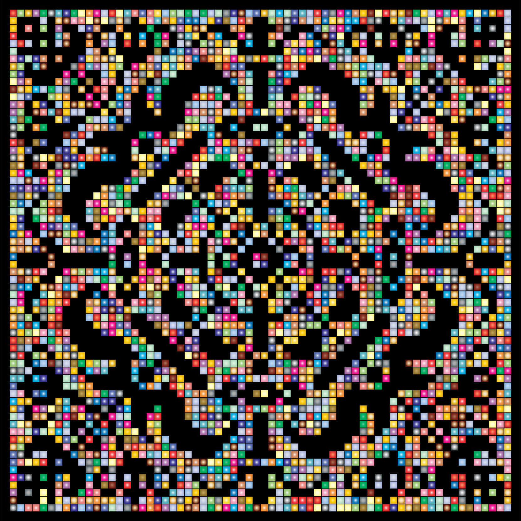 This is a colorful and intricate pattern made up of various shapes, including circles. These shapes are arranged in such a way that they form a larger circle within the overall design. The colors used in this pattern are vibrant and diverse, creating an eye-catching visual effect. The combination of different shapes and colors gives the impression of a complex and intricate artwork, making it an interesting focal point for viewers.