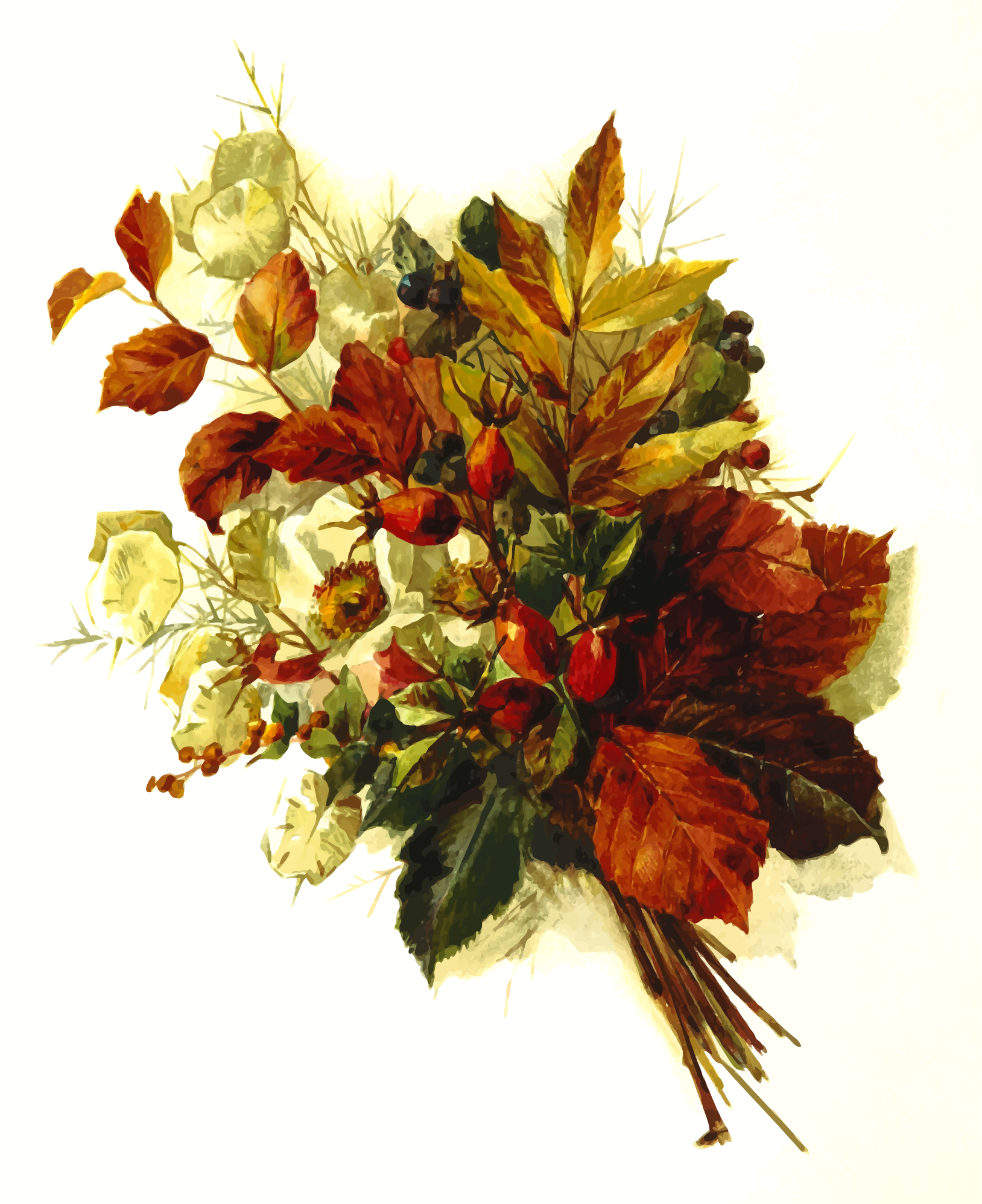 This features a beautiful bouquet of flowers, including leaves and berries. There are several white flowers in the arrangement, as well as some red ones. The bouquet is held together with stems, creating an elegant display. The flowers are arranged in such a way that they fill most of the frame, showcasing their vibrant colors and natural beauty. This artistic composition creates a sense of harmony and tranquility, making it an appealing visual experience for anyone who appreciates nature's beauty.