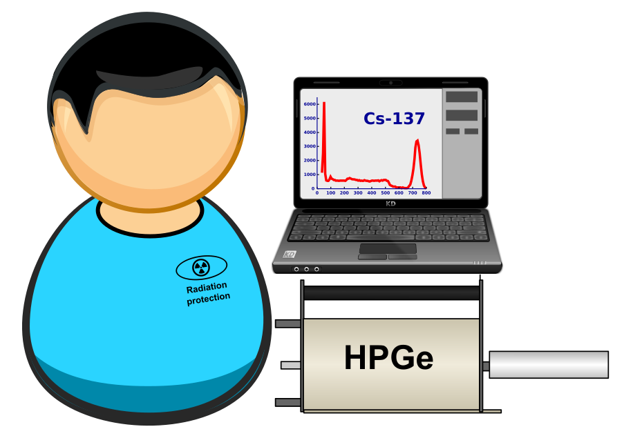 This features a cartoon man standing next to an HPGe semiconductor detector and laptop. The man is wearing a blue shirt, and the laptop screen displays a graph with the number 137 on it. The scene appears to be set in a laboratory or workspace environment where scientific research might take place.