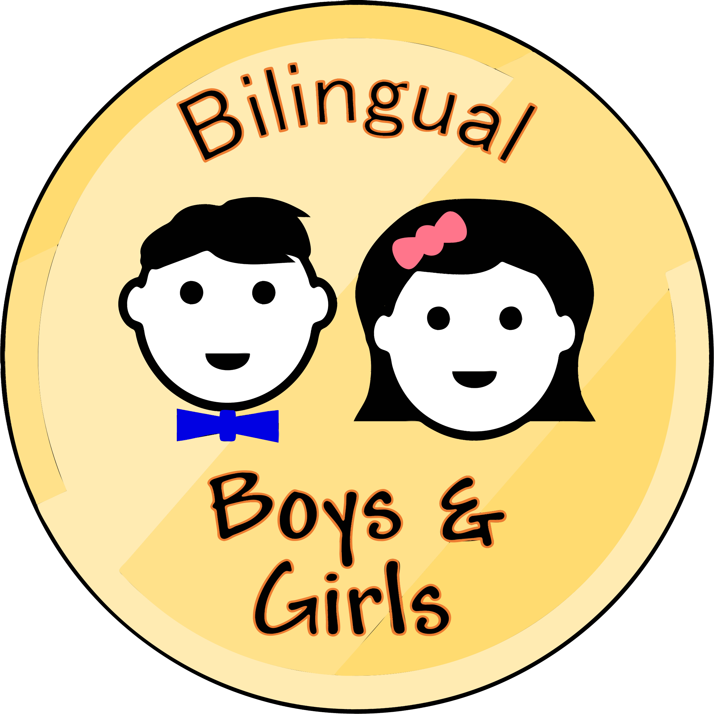 This features a round sticker with two cartoon characters, one male and the other female. They are both smiling and appear to be happy. The sticker is yellow in color and has the words "Bilingual Boys & Girls" written on it. This suggests that the sticker might be related to multilingual learners or promoting bilingualism among children.