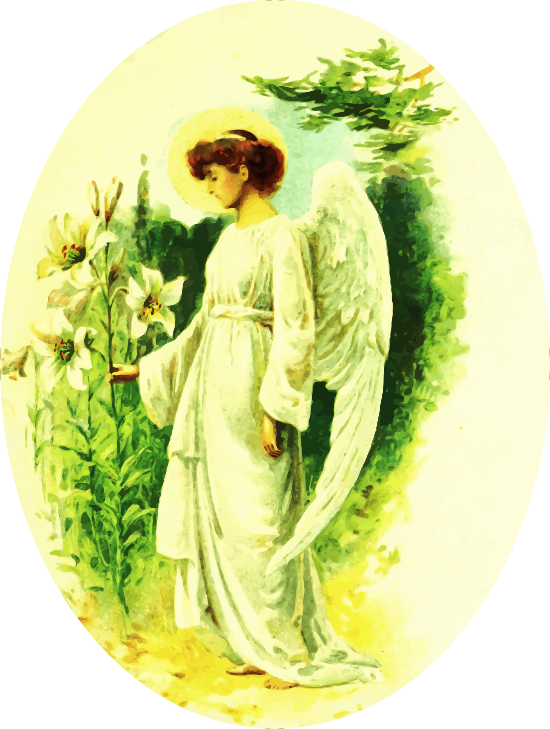 This features a beautiful angelic figure, possibly Mary Magdalene, standing in a field of flowers. She is holding a lily and appears to be looking at it with admiration. The angel's wings are spread out behind her, adding an ethereal quality to the scene. The field of flowers surrounds her, creating a serene and peaceful atmosphere. This artistic depiction captures the essence of innocence and purity often associated with religious figures like Mary Magdalene.