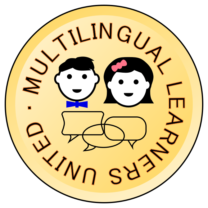 This features a round, multicolored poster with two cartoon characters on it. One character is a boy and the other is a girl. They are both wearing ties, which adds to their charm. The boy has a bow tie while the girl has a regular tie. The poster appears to be promoting multilingual learning or education, as indicated by its title "Multilingual Learners United." The design of the poster is visually appealing and likely intended to attract attention and convey a positive message about language learning.