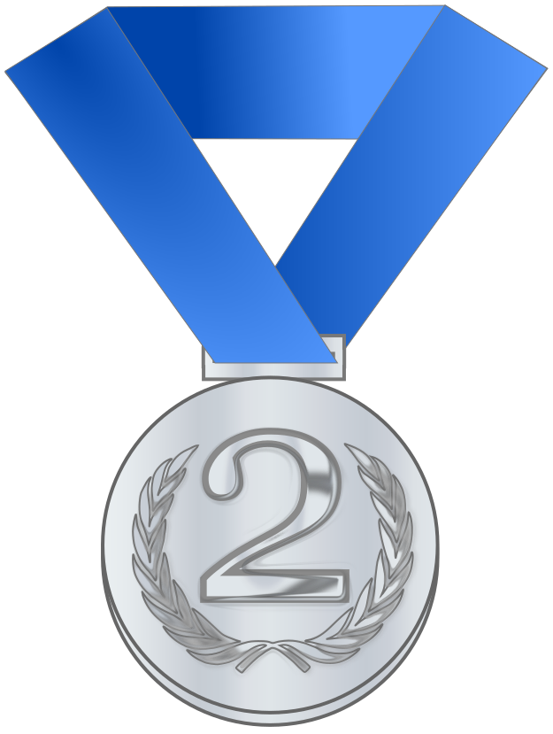 This features a silver medal with a blue ribbon, which is adorned with the number two. This award signifies that the recipient has achieved second place in their respective category or competition. The medal's design and color combination of silver and blue create an elegant and visually appealing presentation. The ribbon adds a touch of sophistication to the overall appearance, making it suitable for various occasions such as sports events, academic achievements, or other recognition ceremonies.