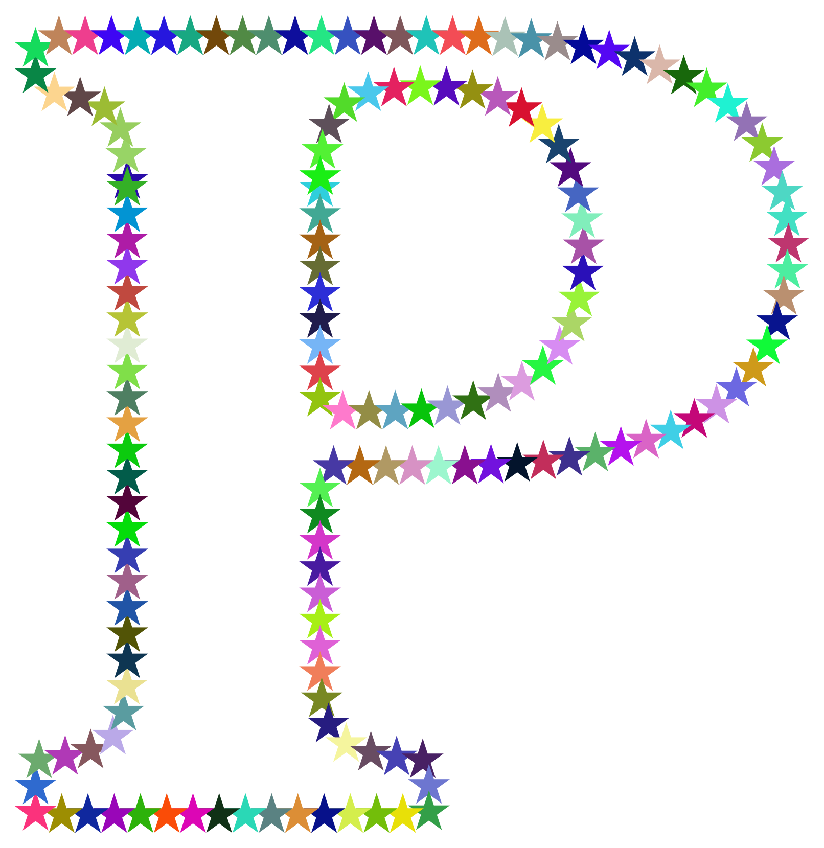 This features a large letter P made up of many small stars. The stars are arranged in various positions around the letter, creating an interesting and visually appealing design. There is a mix of colors among the stars, adding depth and variety to the overall appearance of the letter. This creative arrangement of stars gives the impression that the letter is floating or hovering above the background, making it stand out as a unique and eye-catching piece of artwork.