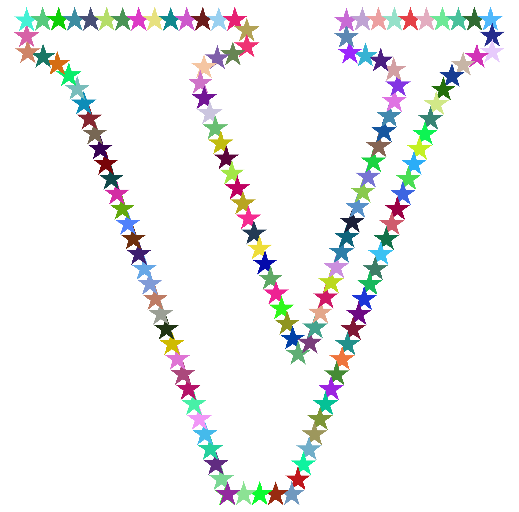 This features a large, colorful V made up of various colored stars. The stars are arranged in such a way that they form the shape of the letter "V" and create an eye-catching display. There is a wide variety of colors used to make up this unique design, including shades like pink, blue, yellow, green, orange, and more. This creative arrangement of stars gives the impression of a vibrant and lively scene that stands out against its background.