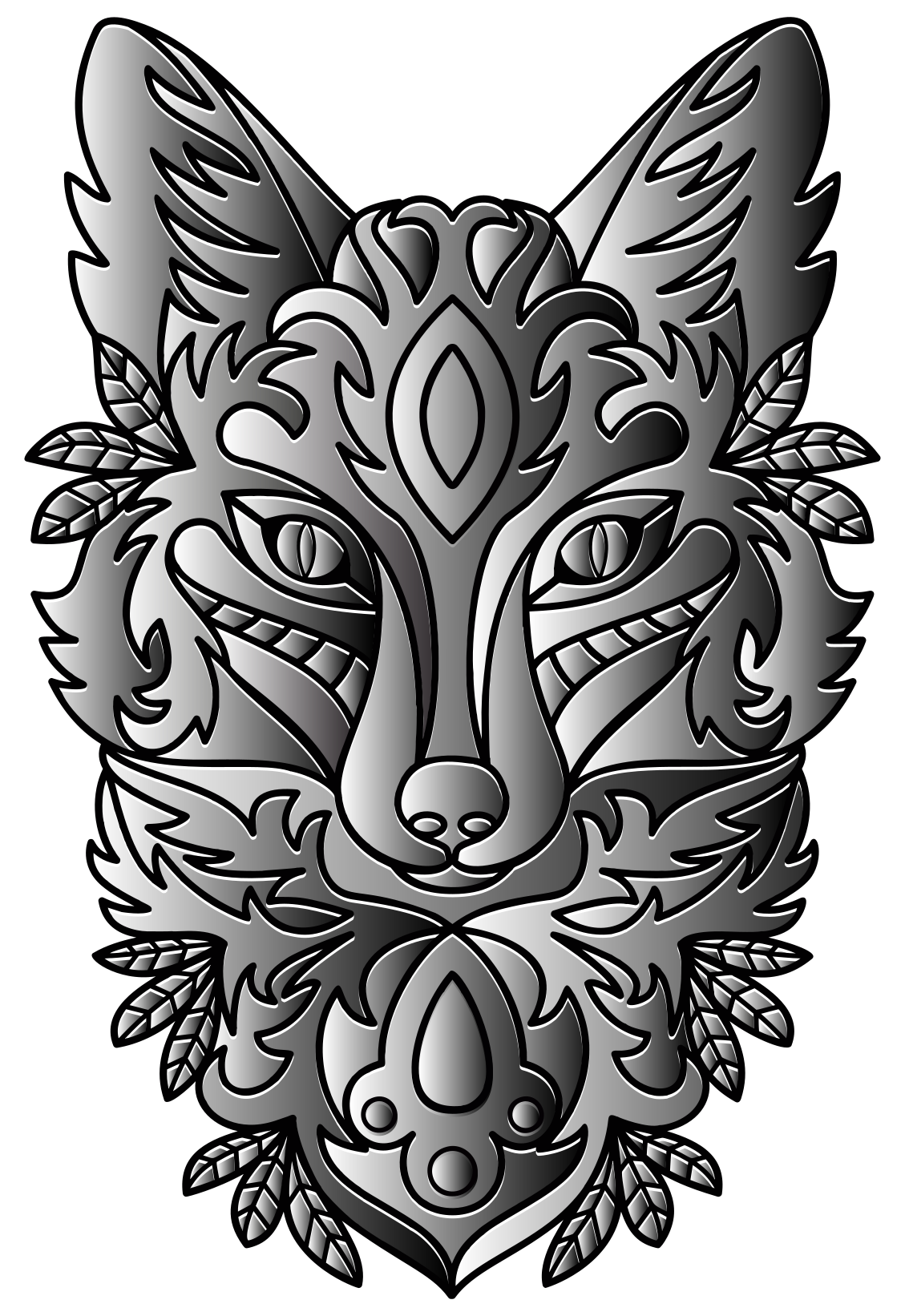 This features a silver fox with an ornate design on its face. The fox's eyes are open, and it appears to be looking directly at the viewer. The intricate details of the fox's face include a nose, mouth, and whiskers. The overall appearance is that of a stylized or decorative representation of a real-life animal.