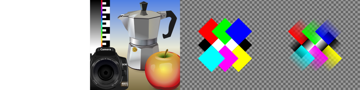This features a close-up of an apple placed next to a silver coffee pot. The apple is positioned on the left side, while the coffee pot occupies most of the right side of the frame. In addition to these two objects, there are three colorful squares in the background, adding a vibrant touch to the scene. These squares appear to be part of a larger image or design, possibly representing different colors or patterns.