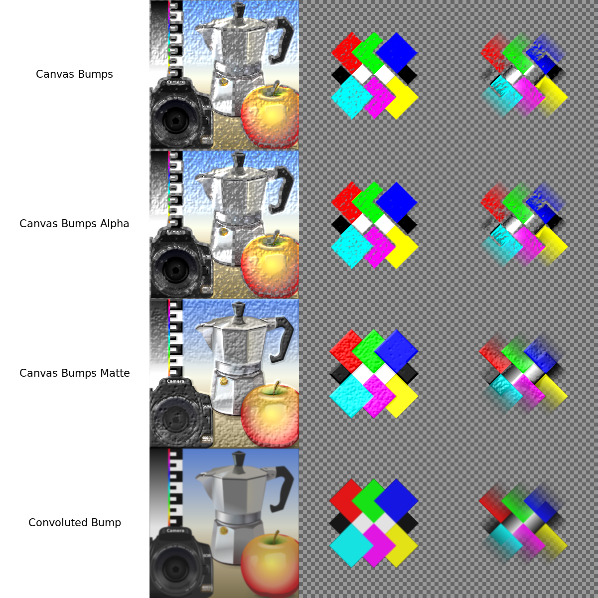 This is a collection of bump filter presets in Inkscape 0.92, showcasing various artistic effects on different objects such as apples and cameras. There are nine distinct images displayed, each featuring a unique combination of colors and patterns. In the first image, an apple with a green background is depicted, while the second image features an apple with a blue background. The third image displays an apple with a red background, followed by an apple in the fourth image with a yellow background. The fifth image showcases an apple with a purple background, and the sixth image has an apple with a pink background. The seventh image is of an apple with a black background, and finally, the eighth image features an apple with a white background. Each of these images highlights different artistic interpretations of apples using various color palettes.