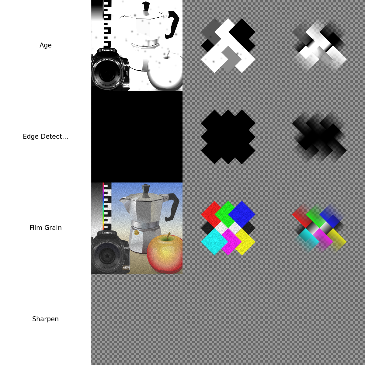 This is a collection of various photo filters, including edge detection and grain. There are six different filters displayed in the image, each with their own unique appearance. One filter displays an apple, while another shows a cup of coffee. These filters can be used to enhance or alter photographs, adding creative elements to the images. The filters are presented in a row, making it easy for users to choose and apply them to their photos.