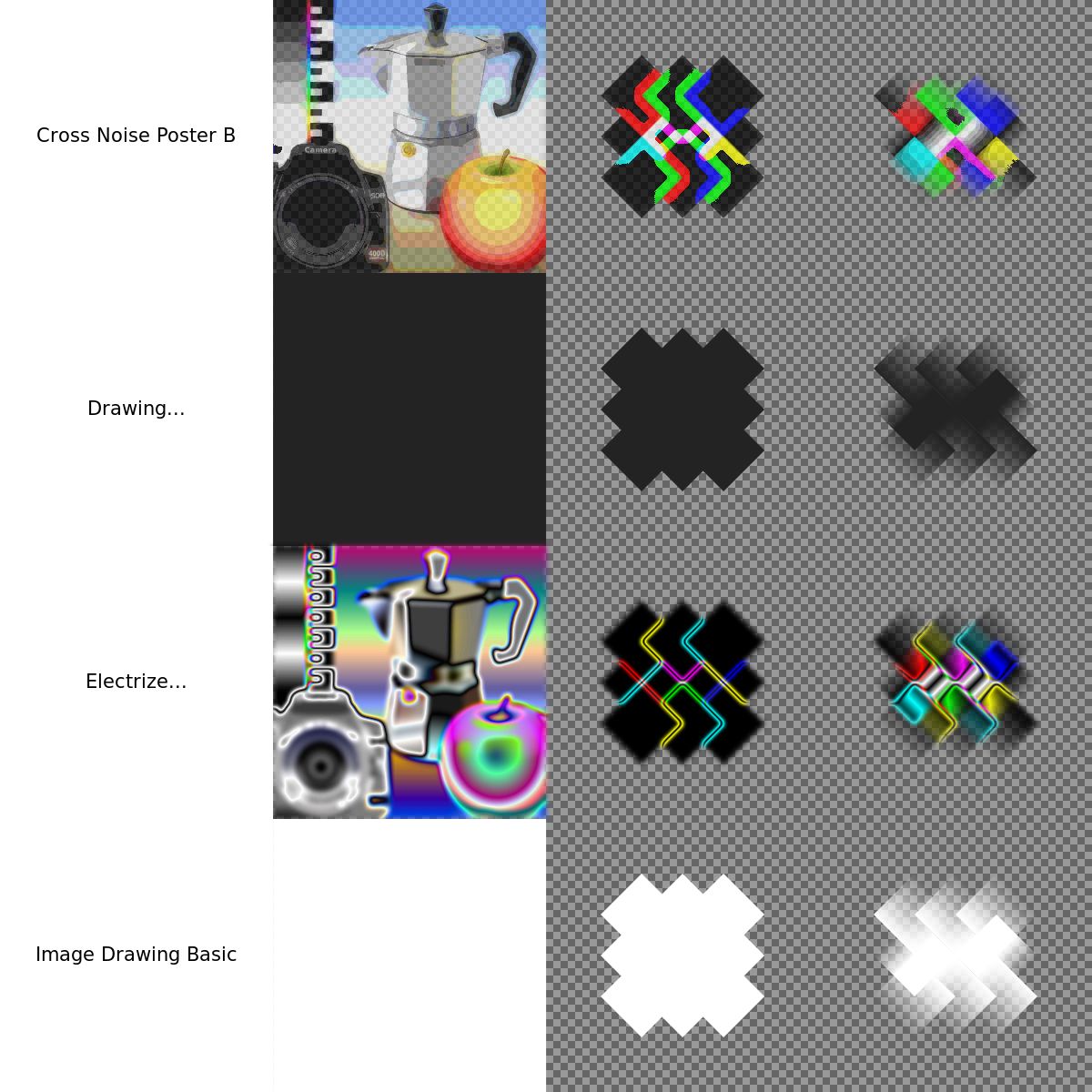 This is a collection of various filters and presets for drawing, painting, and filtering images. There are six different sections in the image, each containing multiple icons representing different filter options. These filters can be used to enhance or alter the appearance of an image, giving it a unique look or feel. Some examples include cross noise, electrify, and drawing basic. The image is displayed on a computer screen with a grid-like pattern in the background.