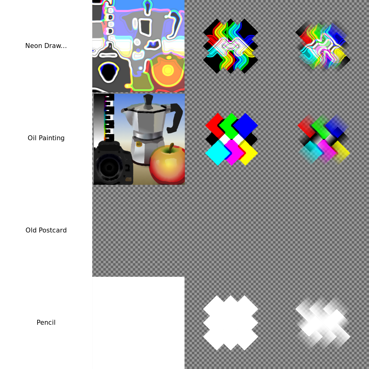 Tags: neon, drawing, oil painting, apple, camera, postcard