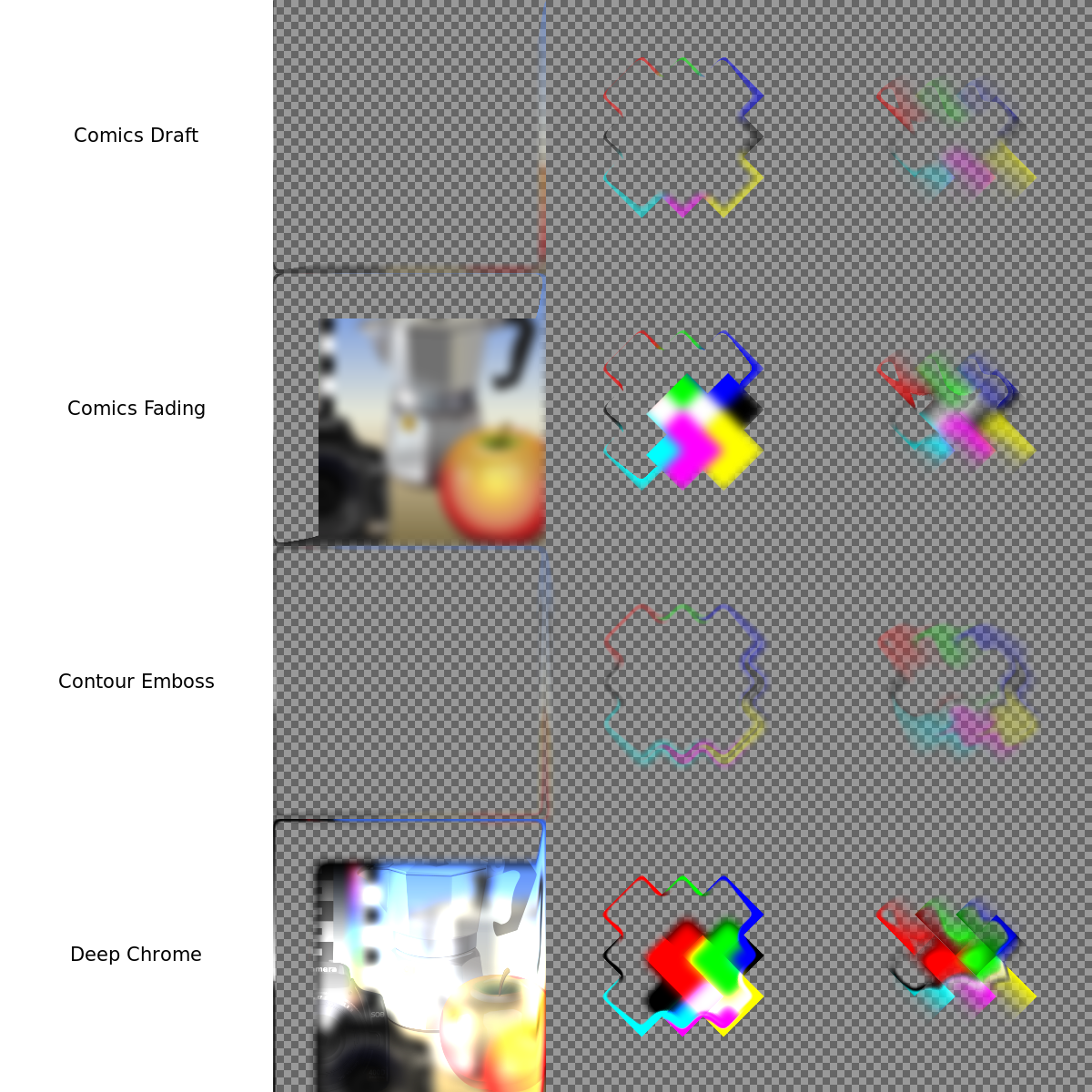 This is a collection of different colored squares, each with a unique filter applied to them. These filters are used in Inkscape 0.92 and include options such as Comic Rading, Deep Chrome, and Contour Emboss. Each square has a label describing the filter it's undergoing, making it easy for users to identify which filter they prefer. The squares vary in size and color, showcasing the versatility of these filters.