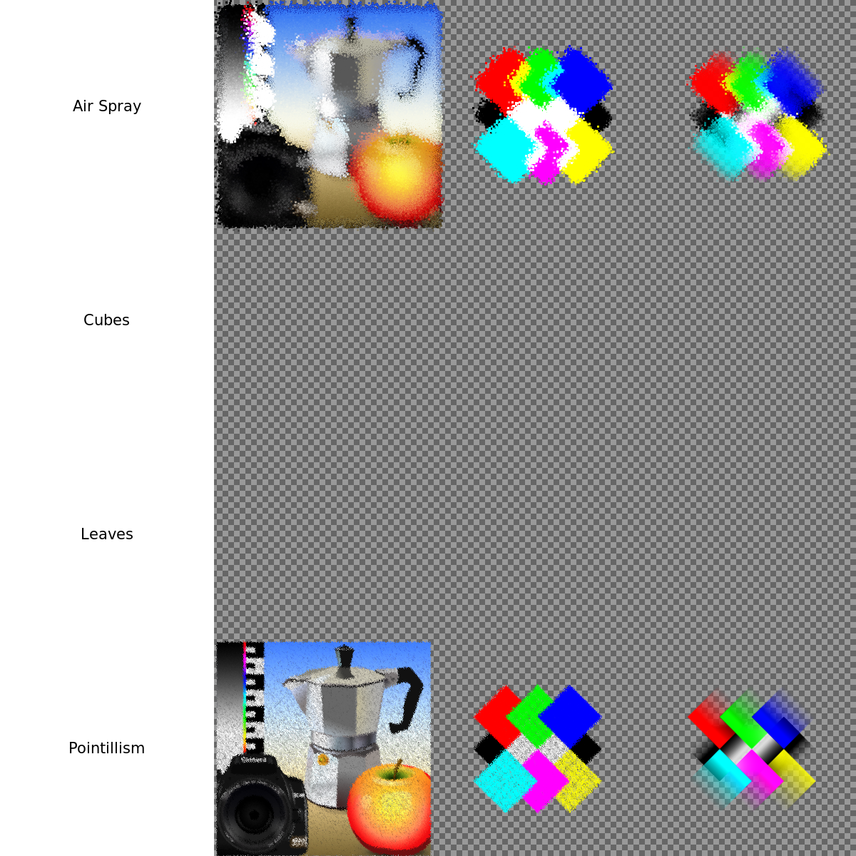 This is a collection of various artistic filters in Inkscape 0.92, with each filter represented by a different colored square. There are five squares in total, each displaying a unique color and design. These filters can be used to enhance the appearance of digital images or other visual content. In addition to the colorful squares, there is also an apple featured prominently in the image. The apple is located towards the center-left side of the frame, adding a touch of natural color and contrast to the overall composition.