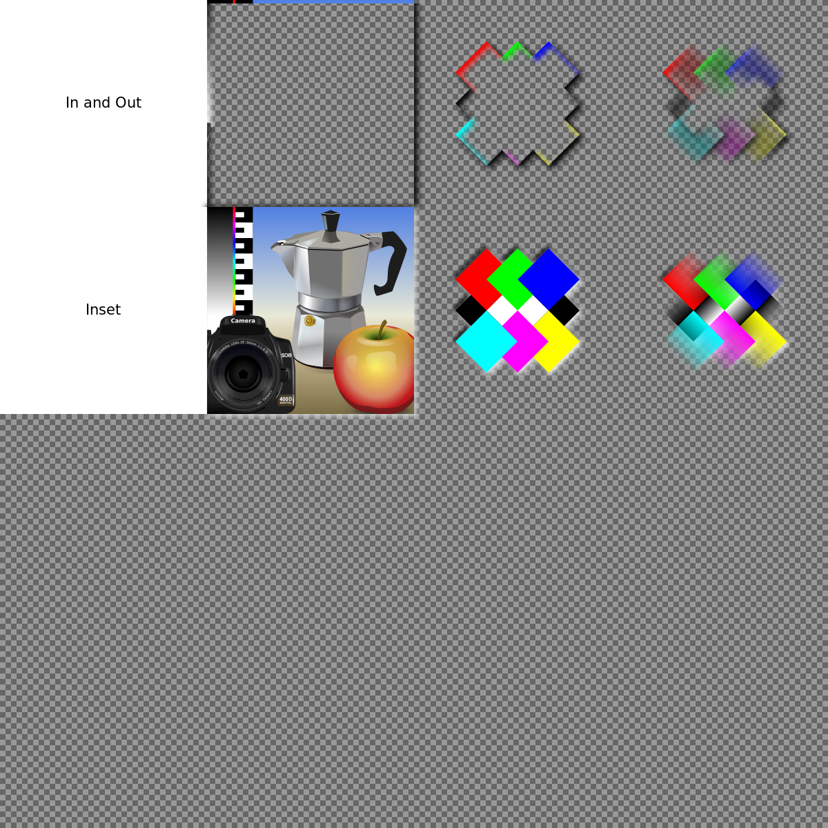 This is a screenshot of an application, likely Inkscape, with various filters and presets displayed. There are four different colored squares in the upper right corner, each representing a unique filter or preset. Above these squares, there is a picture of a coffee pot, which adds to the visual interest of the screen. The image also features an apple placed near the center, adding a touch of color and contrast to the overall composition.