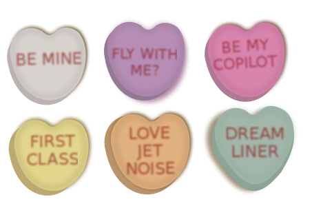 This features a collection of six different colored candy conversation hearts, each with unique messages written on them. These heart-shaped candies are arranged in a row and placed next to one another, creating an appealing display for Valentine's Day or other special occasions. Each heart has a distinct message, such as "Be Mine," "Fly With Me," "Dream Lighter," "First Class Noise," "Love Jet," and "Noise." These candy hearts are likely meant to be shared with loved ones during celebrations or as gifts for special occasions.