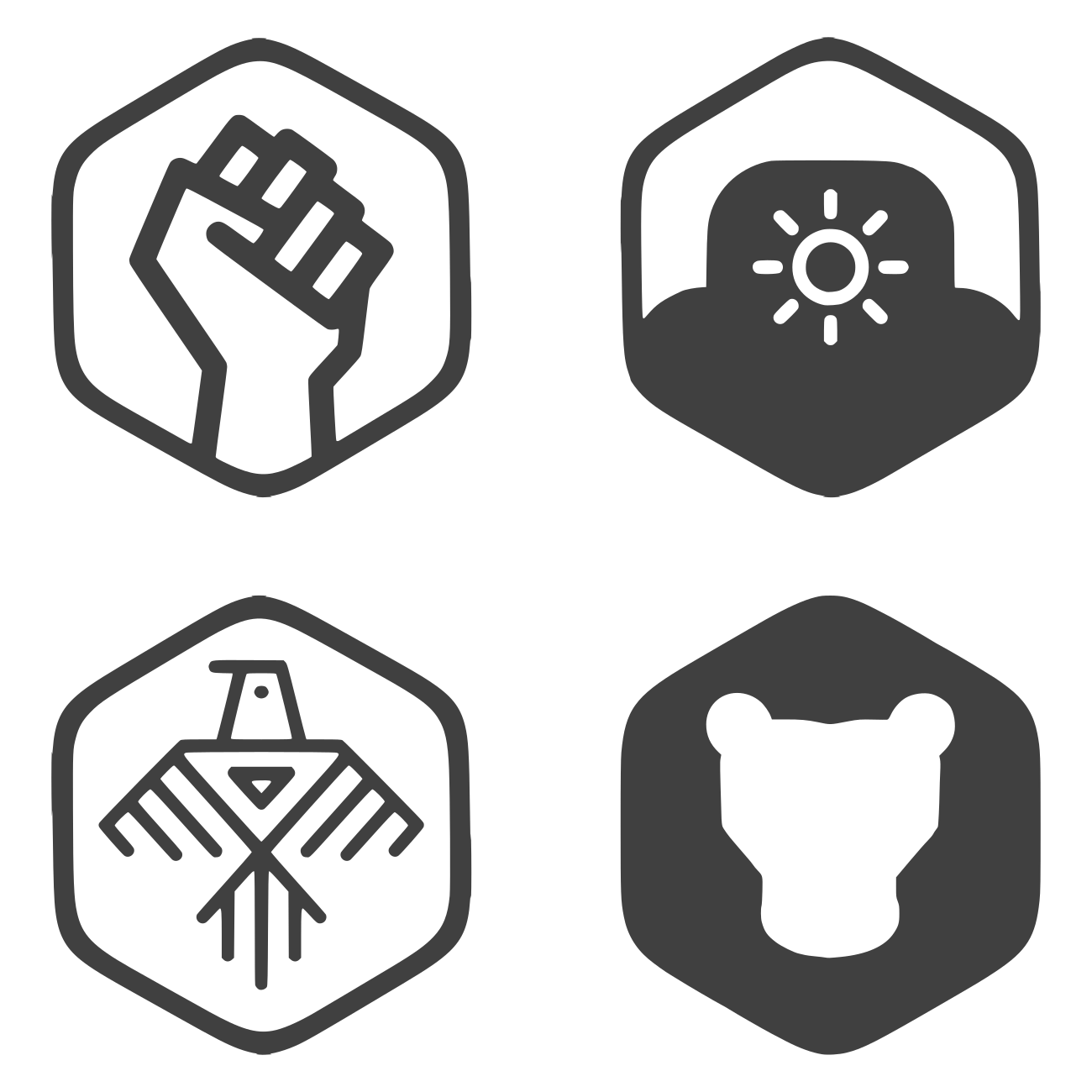 This features four different hexagons, each containing a unique logo. The first hexagon displays a clenched fist, symbolizing strength or defiance. The second hexagon showcases the sun, representing warmth and positivity. The third hexagon contains an illustration of a bird, possibly signifying freedom or flight. Lastly, the fourth hexagon features a bear, which could represent courage or protection. These four hexagons are arranged in a row, each with its own distinct logo, creating a visually appealing and meaningful display.