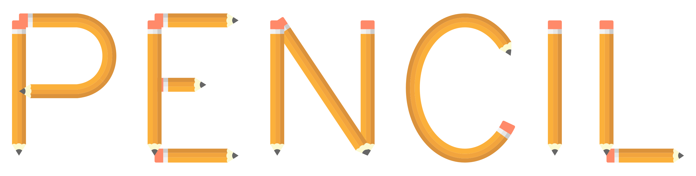 This is a close-up of the word "pencil" written in yellow and orange letters. The font used for this word appears to be bold, making it stand out against the background. The word is displayed prominently on the page, with no other elements or distractions visible. This simple yet eye-catching design could be used for various purposes such as advertising, branding, or even as a decorative piece in an office setting.