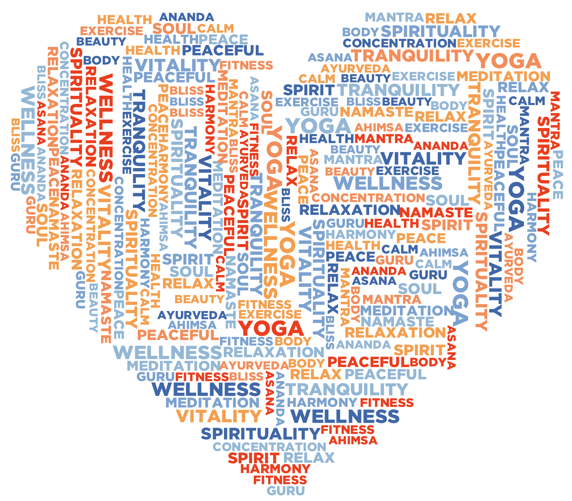 This features a heart-shaped word cloud with various words related to wellness and relaxation. These words include yoga, meditation, tranquility, peacefulness, and spirituality. Additionally, the word cloud includes terms such as exercise, health, vitality, and beauty. The colorful display of words creates a visually appealing representation of these concepts, emphasizing their importance in maintaining overall well-being.