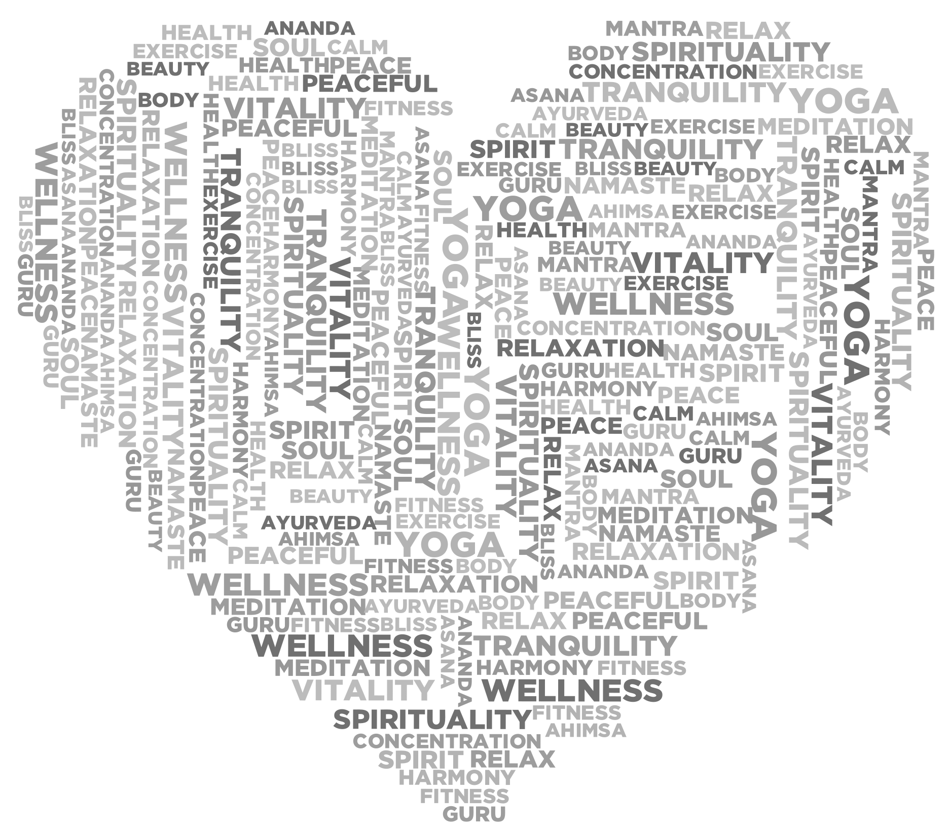 This is a heart-shaped word cloud that contains various words related to wellness and relaxation. These words include yoga, meditation, tranquility, vitality, beauty, peace, and spirituality. There are also several other words scattered throughout the heart, creating a visually appealing display of related terms. The word cloud is likely used as an artistic representation or to convey a message about the importance of wellness and relaxation in our daily lives.