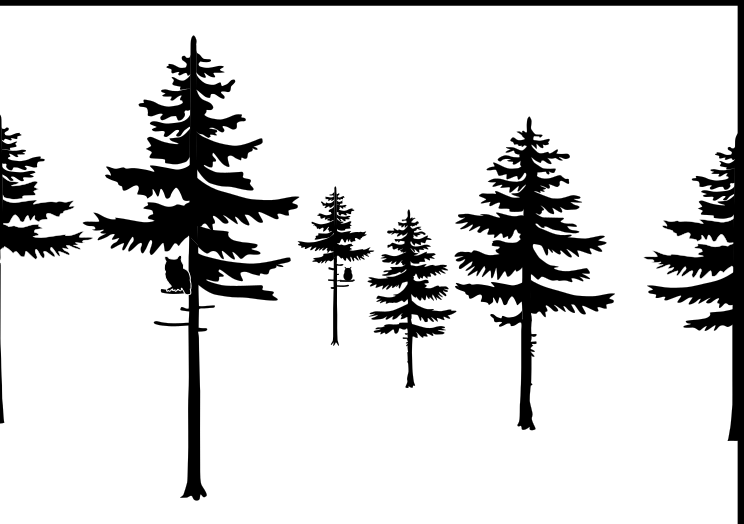 This features a black and white silhouette of several trees, creating an artistic representation of the forest. There are at least nine trees in total, with varying heights and positions within the scene. Some trees are taller than others, while some appear to be shorter or closer to the ground. The overall composition of the image gives a sense of depth and dimension, as if one is looking into the woods from a distance. This black and white representation adds an element of timelessness and elegance to the scene, allowing viewers to focus on the shapes and forms of the trees rather than their colors.