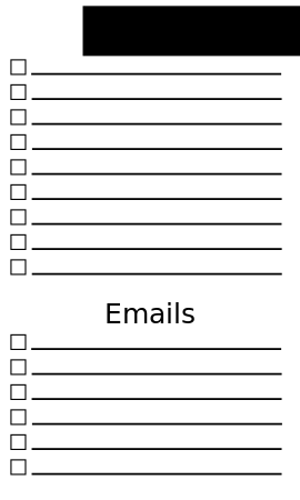This is a black and white checklist of emails. There are several boxes on the left side of the list, each representing an email. The boxes are labeled with the word "Emails" at the top of the page. This checklist appears to be used for organizing or tracking emails, as it provides a clear visual representation of the various emails that need to be addressed.