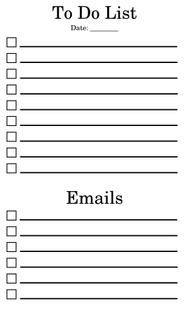 This is a to-do list that includes two main tasks: emails and dates. The list is organized in a table format with columns for the date, task, and any additional notes or reminders. There are several rows of information on this list, indicating that it may be used by someone who needs to keep track of their daily tasks and appointments. The layout of the list makes it easy to read and understand, allowing the user to quickly identify what needs to be done and when.