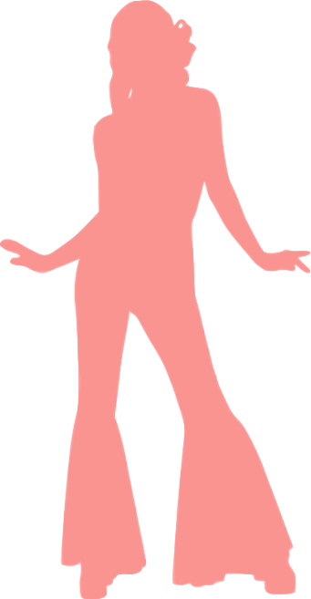 This features a silhouette of a woman wearing bell bottom pants. She is standing with her hands out to the side, giving an impression of movement and gracefulness. The woman's figure is depicted in a light pink color, which adds a touch of elegance to the scene. The overall composition of the image creates a sense of depth and dimension, as it captures the outline of the woman against a contrasting background.
