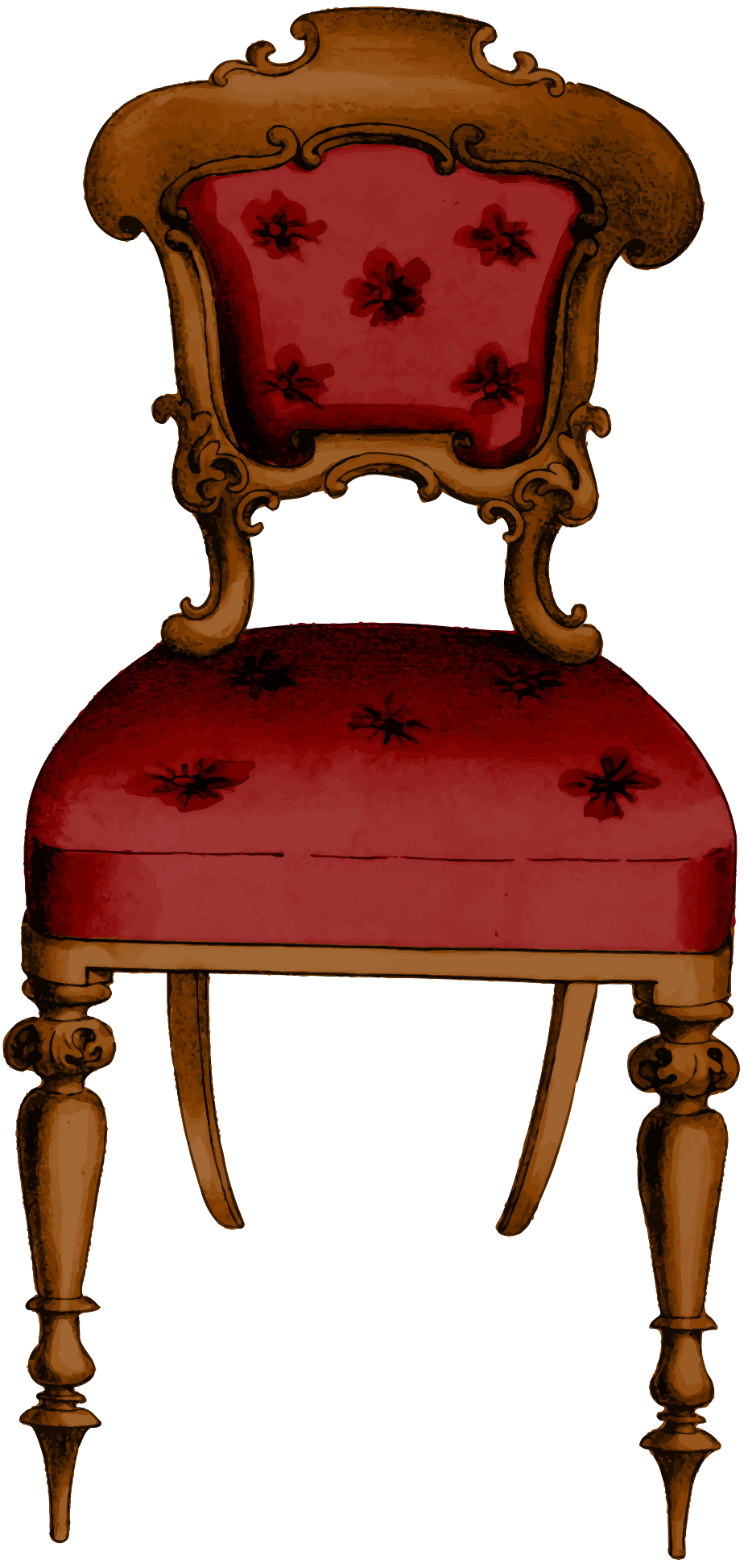 This features a wooden chair with red velvet upholstery. The chair has an ornate design, including a carved wood frame and a fancy backrest. The seat of the chair is covered in red fabric, giving it a luxurious appearance. The chair appears to be placed against a white background, which highlights its intricate details and adds contrast to the scene.