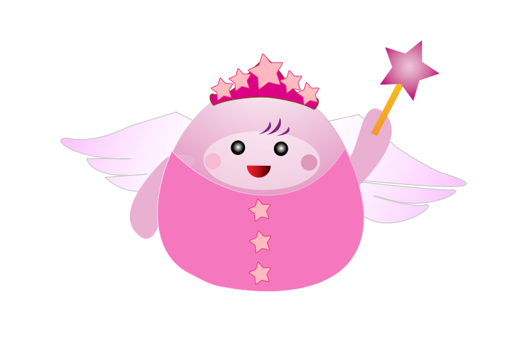 This features a cute cartoon character, possibly a fairy or an angel, wearing a pink dress and holding a wand. The character appears to be smiling as it holds the wand in its hand. The background of the image is white, which provides a clean and simple backdrop for the main subject. This whimsical cartoon figure could be used in various contexts such as children's books, games or even as a decorative element in a child's room.