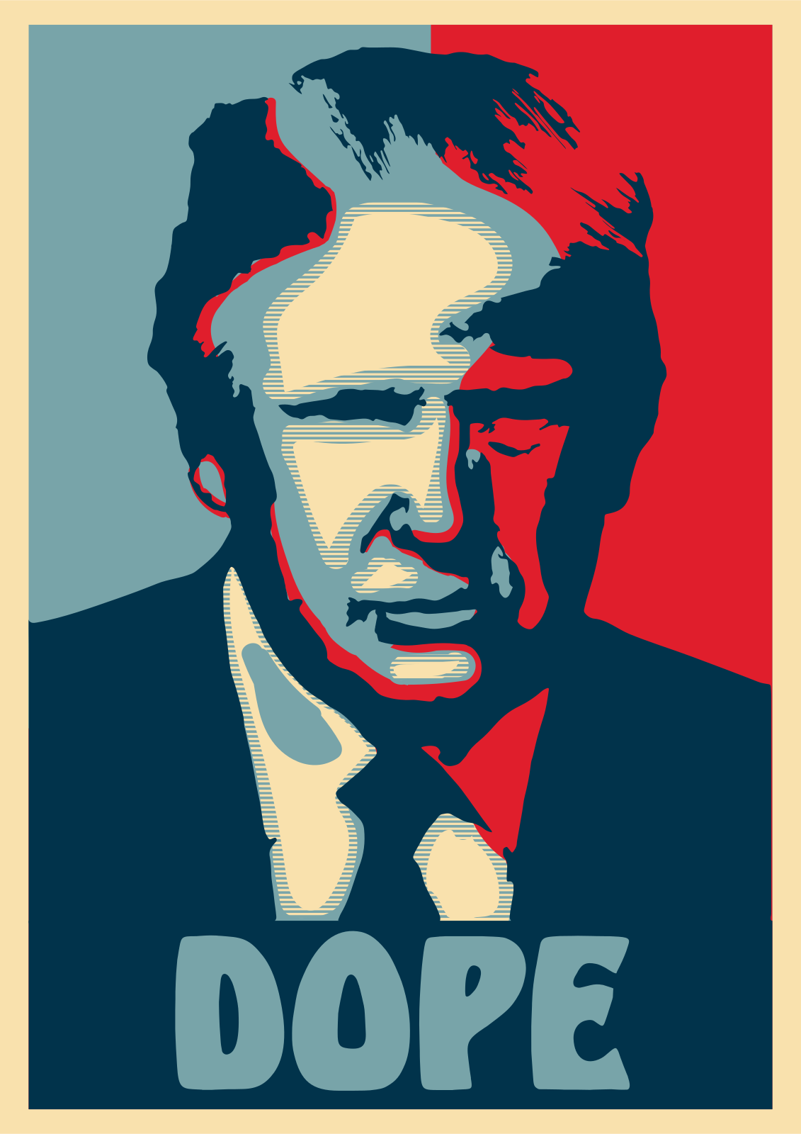 This features a colorful poster of Donald Trump, with his face prominently displayed in the center. The poster is designed to resemble a comic book or a cartoon, giving it an artistic and playful appearance. The colors used on the poster are predominantly blue, red, white, and black, creating a vibrant and eye-catching design. In addition to Trump's face, there is also a word "DOPE" at the bottom of the poster, which adds an element of humor or irony to the overall presentation.