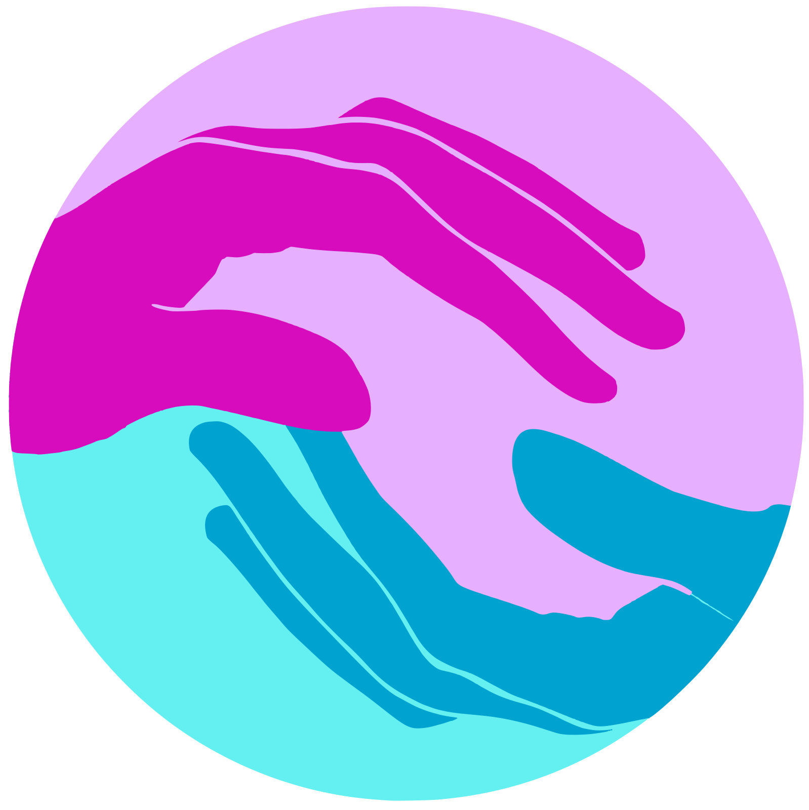 This features a circle with two hands inside it, one on the top and one on the bottom. The hand on the top is dark pink, while the hand on the bottom is blue. These hands are gently touching each other, creating an illustration of a connection between them. The top half of the circle is pink, while the bottom half is blue, adding to the visual appeal and emphasizing the contrast between the two colors. This image could be used for various purposes such as artwork or promoting a message about unity and togetherness.