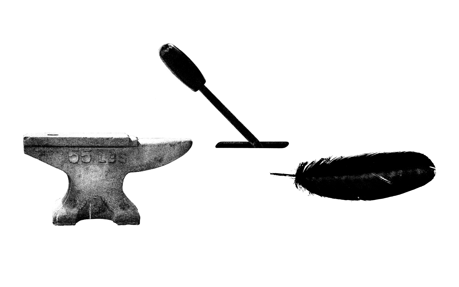 This features a black and white photograph of three objects. In the foreground, there is an old-fashioned anvil with a wooden handle. Next to it, there is a switch with a metal handle, which appears to be in use. Lastly, there is a feather resting on top of the switch, adding a unique touch to the scene. The combination of these objects creates an interesting and somewhat unusual composition that captures the viewer's attention.