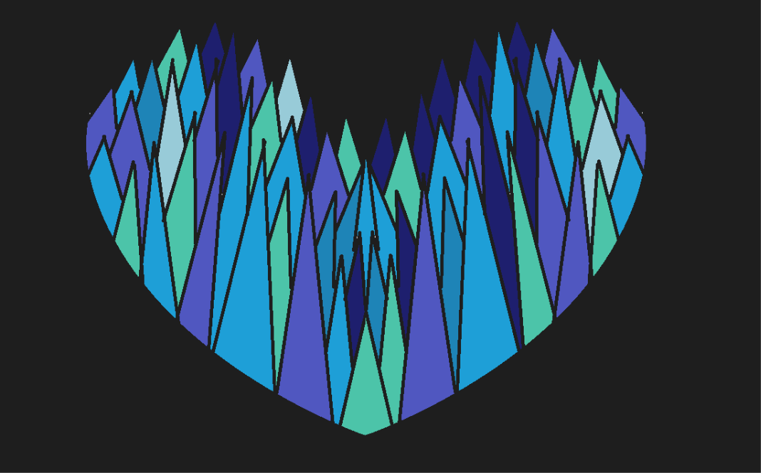 This features a heart shape made up of various shades of blue, green, and purple icicles. These icicles are arranged in such a way that they create the appearance of a heart. The background of the picture is black, which provides a striking contrast to the vibrant colors of the icicles. This unique design creates an eye-catching visual effect that draws attention to the heart shape.