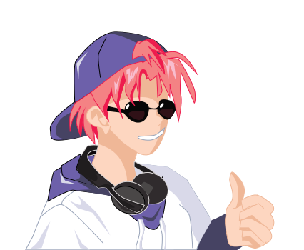 This features a cartoon character with pink hair, wearing sunglasses and a backwards purple hat. He is smiling and giving a thumbs up sign, indicating his approval or agreement. The character is also wearing headphones around his neck, adding to the casual and laid-back vibe of the scene.