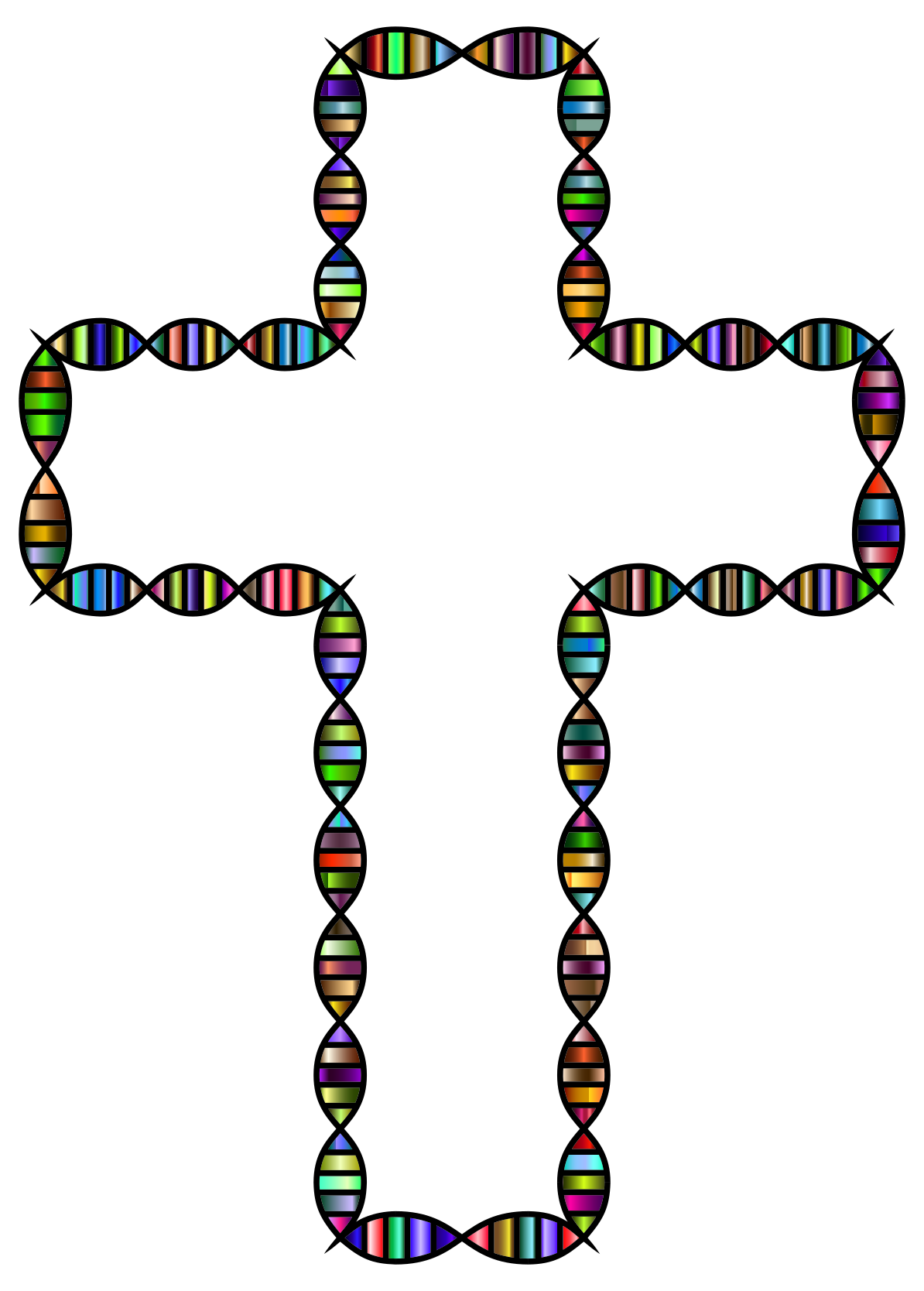 This features a cross made up of many different colored DNA strands. These DNA chains are arranged in various patterns, creating an intricate and visually appealing design. The cross is surrounded by a circle that further emphasizes the central theme of the DNA pattern. This unique artwork combines religious symbolism with scientific concepts, making it an interesting and thought-provoking piece.